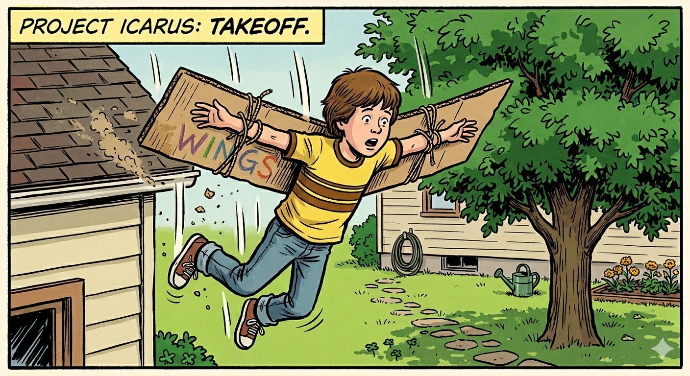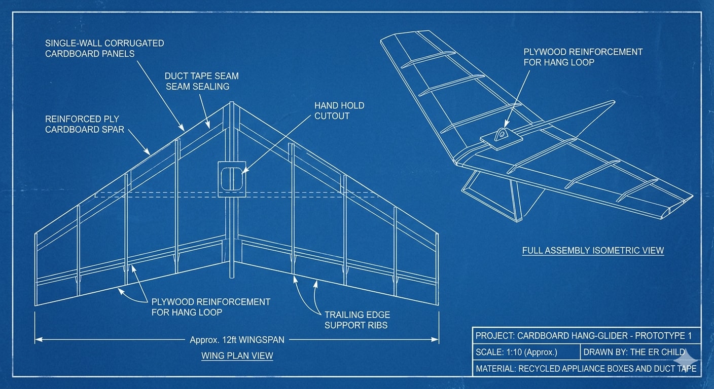 ( Wait, wings are too small, what about a hang-glider made out of cardboard?)
